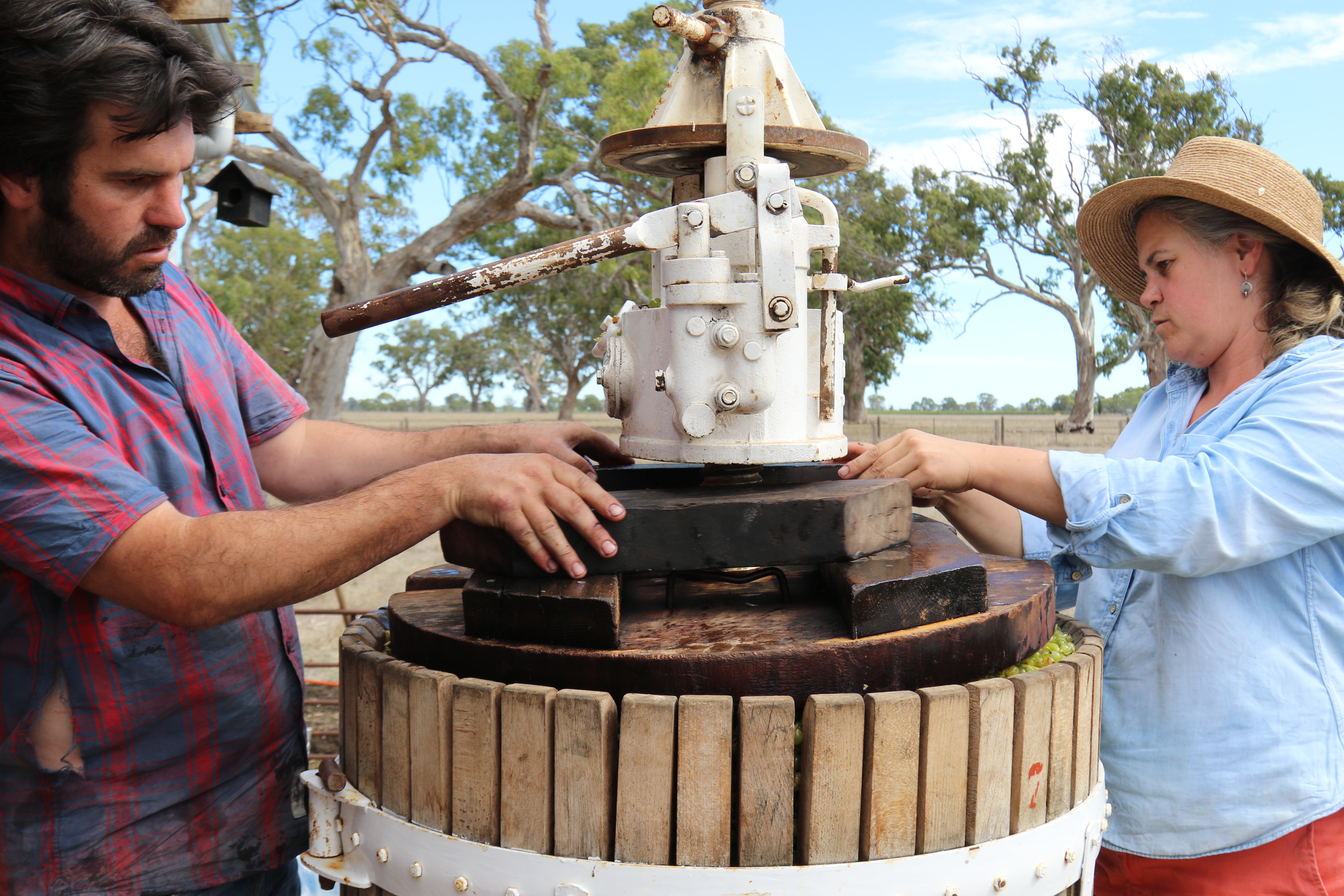 Steve Brown and Sue Bell work the press at Bellwether Wines.