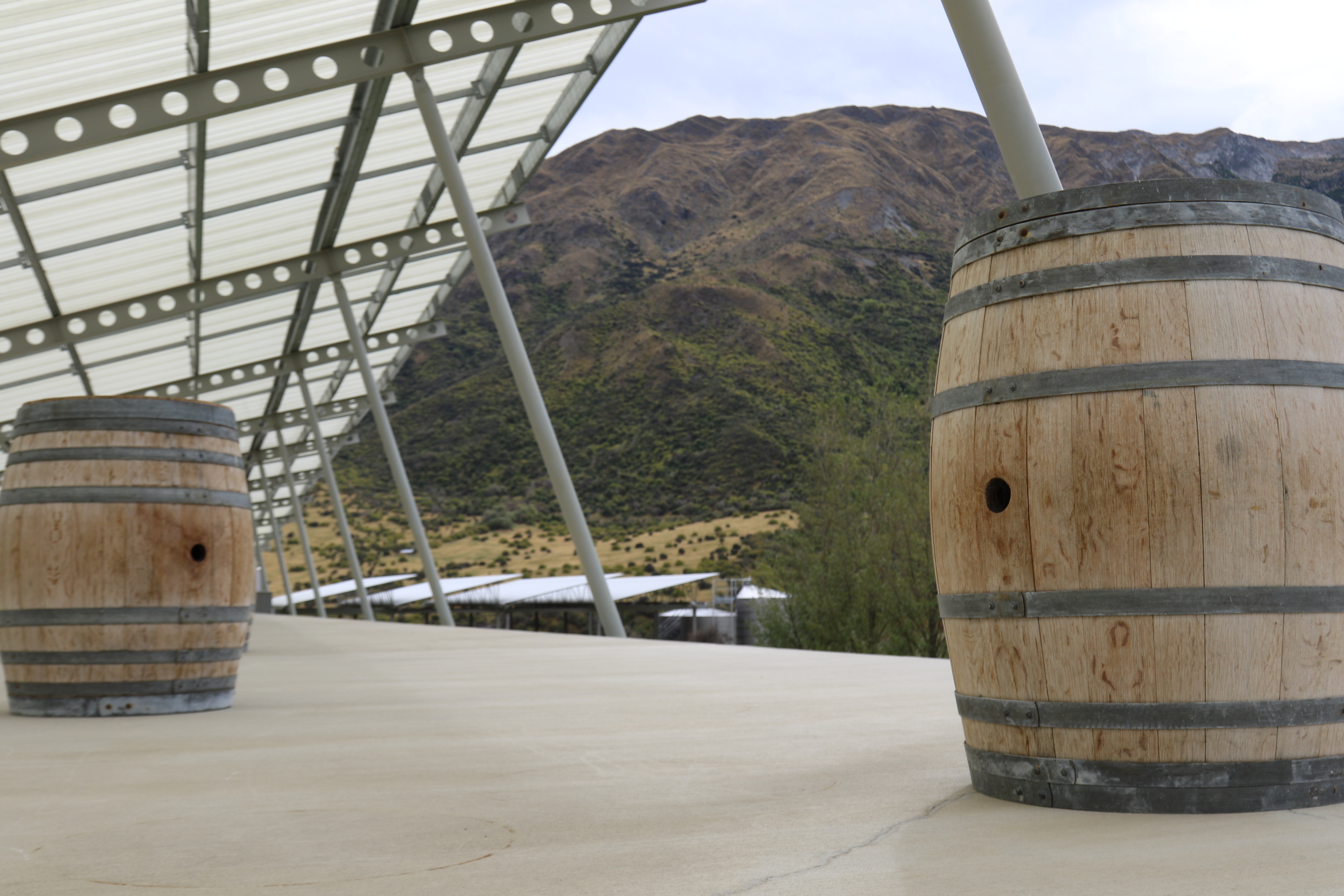 A mountain view with wine barrels at Peregrine Wines in New Zealand.